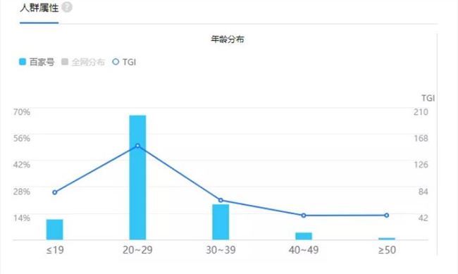 那么目前百家號(hào)這個(gè)平臺(tái)的粉絲年齡主要集中在20- 29 歲,占了整個(gè)平臺(tái)的66.37%,30- 39 歲的粉絲占了19.35%,除此之外,還有一些小部分的群體。那么從下面這張圖就可以看出,百家號(hào)這個(gè)平臺(tái)的粉絲多以年輕人為主。